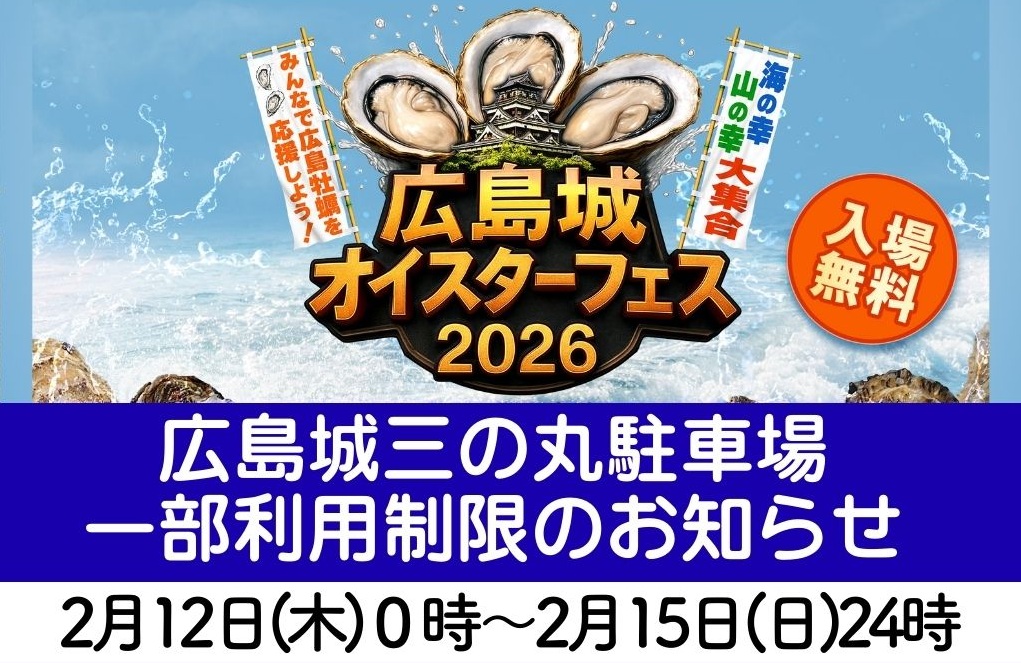 広島城オイスターフェスにおきまして、広島城三の丸駐車場(タイムズ中央公園広島城三の丸)の一部がイベント会場として使用されます。