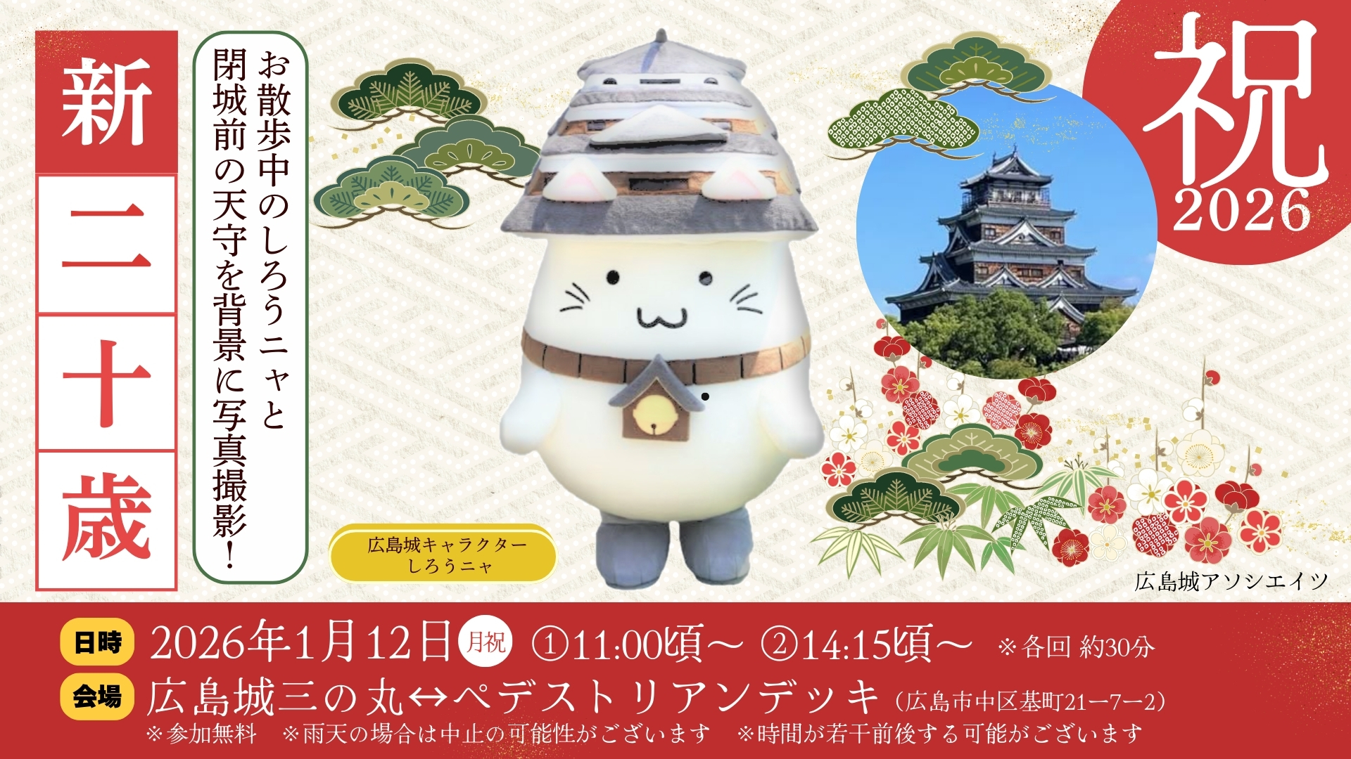 祝・新二十歳!しろうニャと広島城天守を背景に写真を撮ろう! 2026.01.12 ー2026.01.12 MORE 広島城三の丸 年末年始のご案内 2025.12.28 ー2026.01.03 MORE 閉城前の天守に入れる“最後”のコスプレイベント!「城コス!広島きゃっする」 2025.12.07 ー2025.12.07 MORE お城でクリスマス in 広島城三の丸 2025.12.05 ー2025.12.25 MORE 【終了】初開催!日本酒片手に「広島城三の丸 呑める古本まつり」 2025.11.21 ー2025.11.24 MORE 【終了】広島城三の丸で楽しむ秋の三連休!こだわりの逸品が集う「暮らし彩り市」を開催 MORE お堀を巡る「広島城遊覧船」10月25日(土)運航開始! MORE 広島城三の丸駐車場 一部利用制限のお知らせ MORE